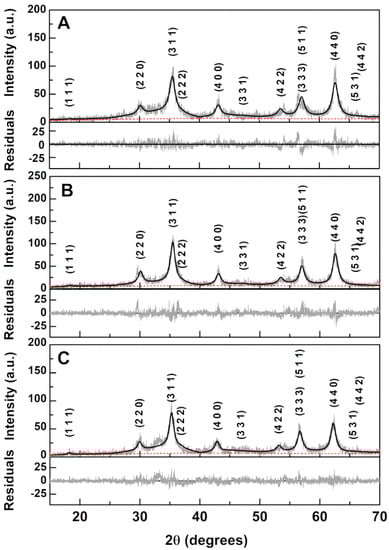 XRD patterns with Miller indices of the synthesized calcium-substituted magnesium ferrite nanoparticles. (A): Ca0.25Mg0.75Fe2O4; (B): Ca0.50Mg0.50Fe2O4; (C): Ca0.75Mg0.25Fe2O4. Gray lines: experimental patterns; black lines: fitted patterns; red dashed lines: background.