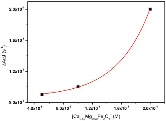 The sedimentation kinetics of the synthesized calcium-substituted magnesium ferrite nanoparticles was followed by measuring the UV–Visible absorption of nanoparticle dispersions as a function of time. The results for Ca0.50Mg0.50Fe2O4 NPs, obtained as the slopes of the absorption variation function over time, for three different NP concentrations, are shown as an example (Figure 3). A similar behavior was observed for all nanoparticles, with high stability for concentrations below 1 × 10−4 M and sedimentation exponential growth for higher concentrations. However, after one hour, the nanoparticles remained extremely dispersed, in percentages of 85%, 82%, and 97% for Ca0.25Mg0.75Fe2O4, Ca0.50Mg0.50Fe2O4, and Ca0.75Mg0.25Fe2O4, respectively. This is a positive indication that the stabilities of the nanoparticles’ aqueous dispersions are suitable for biomedical applications.