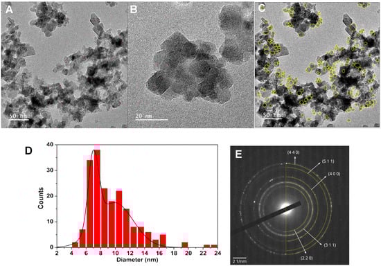 Transmission electron microscopy (TEM) images, together with small area electron diffraction (SAED), for Ca0.50Mg0.50Fe2O4 nanoparticles are shown in Figure 4. Upon manual outline of 193 particles (Figure 4C), the size was determined considering an equivalent area circle. The analysis of the corresponding size histogram (Figure 4D) resulted in two populations, with sizes 7.0 ± 0.7 nm and 9.9 ± 2.5 nm. The larger population probably corresponds to image projections of nanoparticle aggregates. The deviation from sphericity was analyzed by comparing the particle’s perimeter with that calculated with the equivalent area circle. The majority of the particles have 0.95 sphericity, while a 5% fraction shows a value of 0.84. SAED results (Figure 4E) are compatible with a spinel ferrite crystal structure, as seen from the added semicircles. These correspond to spinel structure d-spacings calculated using the same lattice constant that was obtained from XRD Rietveld analysis (8.3915 Å).