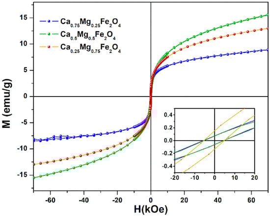 Figure 5 shows the magnetization hysteresis cycles of synthesized calcium-substituted magnesium ferrite nanoparticles, displaying the relationship between the induced magnetic moment and the applied magnetic field (H) at room temperature. The magnetic properties, saturation magnetization (Ms), remnant magnetization (Mr), and coercive field (Hc) are presented in Table 2. Higher saturation magnetization values were obtained for Ca0.25Mg0.75Fe2O4 and Ca0.5Mg0.5Fe2O4 nanoparticles, with 12.98 Oe and 15.63 Oe, respectively. A lower value of Ms, 8.83 Oe, was observed for Ca0.75Mg0.25Fe2O4, indicating that Ca2+ ions migrated to B-sites, leading to a decrease of Fe3+ ions in B-sites (and corresponding increase on A-sites), resulting in a lower magnetization.