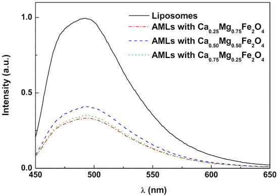 The curcumin encapsulation in AMLs based on the three different ferrite nanoparticles was investigated by fluorescence emission (Figure 6). The fluorescence spectra were compared between liposomes (of the same lipid composition but without magnetic nanoparticles) and AMLs, both encapsulating curcumin. The emission spectra allow confirming the incorporation of curcumin in vesicles, exhibiting a quenching effect of drug fluorescence in the presence of magnetic nanoparticles (as expected from the wide wavelength range of nanoparticles absorption). No significant shifts in the band of curcumin were noted between liposomes and AMLs, indicating a similar environment felt by curcumin in the different nanosystems.