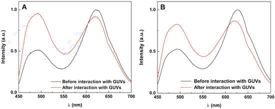 The hydrophobic nature of curcumin causes difficulties in its release from (magneto)liposomes. Therefore, it is important to assess whether the developed nanosystems can fuse with model membranes, allowing drug release. This capability was investigated by FRET, using curcumin as energy donor and the lipid probe Nile Red as an energy acceptor [], both included in the magnetoliposomes. Giant unilamellar vesicles (GUVs) [,] were used as models of cell membranes. Exciting only the donor curcumin, a strong fluorescence band due to Nile Red emission is observed (maximum emission wavelength at ca. 625 nm). This is a consequence of the nonradiative energy transfer (FRET) from curcumin to Nile Red (Figure 7). After interaction with GUVs, the donor (curcumin) fluorescence increases and the acceptor emission band decreases, proving the decrease of efficiency of FRET process and, consequently, confirming the membrane fusion between aqueous magnetoliposomes and the model membranes. PEGylated magnetoliposomes (Figure 7B) also present fusion capabilities, but to a slightly lower extent, as inferred from the lower increase of donor fluorescence (maximum emission around 500 nm) after interaction with GUVs.