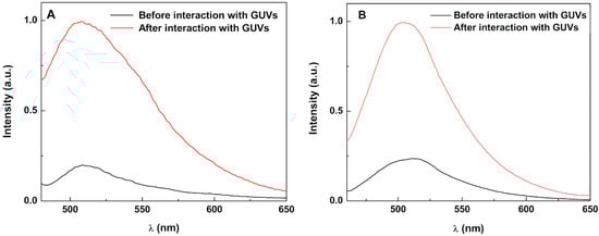 To investigate the interaction of SMLs with model membranes (GUVs), FRET assays were not used. Usually, FRET is not observed due to the strong quenching of both donor and acceptor emissions by the cluster of magnetic nanoparticles [,], which is very close to the fluorophores (due to the absence of the aqueous pool). Instead, if interaction with GUVs occurs, an unquenching effect should be observed. Taking advantage of curcumin’s intrinsic fluorescence, the assay was performed using curcumin-loaded magnetoliposomes. Upon interaction with GUVs, a significant rise in curcumin fluorescence was observed (unquenching effect), proving the increase in distance between the nanoparticles and the fluorescent drug due to membrane fusion (Figure 8). The effect is also observed for stealth (PEGylated) SMLs (Figure 8B). Although curcumin can bind through its enolic group to divalent metal ions on nanoparticle surfaces (originating an emission quenching) [], the unquenching effect after interaction with GUVs demonstrates that curcumin is released from the nanocarriers.