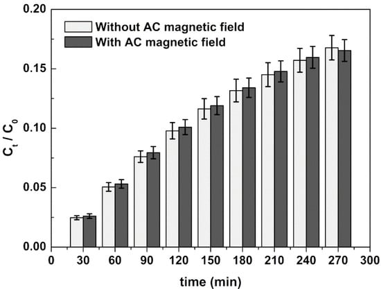 Drug release profile of curcumin from DPPC SMLs with and without the application of an alternating magnetic field. Experimental data is presented as average value ± standard deviation of three independent assays.