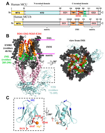 Structural elucidation of the human MCU pore. (A) Domain architecture of human mitochondrial Ca2+ uniporter (MCU) (Uniprot accession Q8NE86) and MCUb (Uniprot accession Q9NWR8). The conserved coiled-coil and transmembrane regions are shaded salmon and orange, respectively. The residue ranges based on Uniprot annotation are indicated above the respective domain. The topological orientation relative to the inner mitochondrial membrane (IMM) is indicated below the diagrams and the amino (N)-terminal and carboxyl (C)-terminal domains that have been the focus of separate structural studies [162,163,164] are indicated above the diagrams. (B) Human MCU tetramer in complex with four essential MCU regulator (EMRE) peptides. The EMRE peptides (black spheres) are oriented with the N-termini in the matrix and the C-termini in the IMS. The EMRE N-termini are situated adjacent to the JML (green spheres), stabilizing the loop conformation. The MCU N- and C-termini are oriented in the matrix. The MCU C-terminal domain (salmon cartoon representation) assembles as a symmetric tetramer, while the N-terminal domain (cyan cartoon representation) exhibits a more linear/crescent tetramer assembly. The Asp-Ile-Met-Glu (DIME) motif (red sticks), important for Ca2+ selectivity and permeation, is indicated near the IMS opening of the channel. (C) Human MCU-N-terminal domain (MCU-NTD) structure showing the location of various sensory input sites. The glutathionylation C97 and phosphorylation S92 post-translation modification sites (blue sticks) are indicated. The negatively charged Asp residues (red sticks) in close proximity to the Mg2+ (orange sphere) binding site are shown. In B and C, colours of MCU regions are consistent with panel A. JML, juxtamembrane loop; IMM, inner mitochondrial membrane; IMS, intermembrane space; NTD, N-terminal domain. The structure figures were made using the 6O58 [154] and 5KUJ [164] pdb coordinate files for the MCU-EMRE complex and MCU-NTD, respectively. MTS, mitochondrial targeting sequence; CC1, -2, coiled-coil-1, -2; TM1, -2, transmembrane-1, -2; N, amino terminus; C, carboxyl terminus.