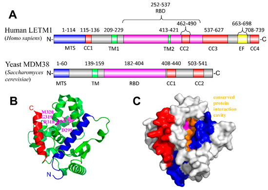 Structural insights into potential LETM1 interaction interfaces. (A) Domain architecture of human LETM1 (Uniprot accession O95202) and the yeast LETM1 homologue (MDM38; Uniprot accession Q08179). The predicted/putative location of four coiled-coil domains (red), two transmembranes helices (green), EF-hand Ca2+-binding motif (yellow), mitochondrial targeting sequence (blue), ribosome binding domain (magenta) and 14-3-3 like domain (cyan) are indicated with residue ranges shown above the respective segment based on the Uniprot annotation. (B) Yeast MDM38 ribosome binding domain crystal structure exhibiting a 14-3-3 like fold. The amino (N)-terminal and carboxyl (C) terminal helices are coloured blue and red, respectively. The N-terminal helix has been previously implicated in mediating protein-protein interactions of the structurally homologous human 14-3-3 epsilon protein [219]. The conserved residue positions necessary for functional human LETM1 assembly and growth complementation of yeast deficient in MDM38 [220] are coloured magenta (i.e., D295, R318, G319, M320 in yeast MDM38; shown as sticks). (C) Surface representation of the yeast MDM38 ribosome binding domain showing a putative substrate/protein interaction cavity (orange), which may interact with phosphorylated proteins akin to human 14-3-3 structural homologues [219]. CC1 -2, -3, 4, coiled-coil-1, -2, -3; TM1, -2, transmembrane-1, -2; EF, EF-hand; RBD, ribosome binding domain; MTS, mitochondrial targeting sequence. The structure figures were made using the 3SKQ [219] pdb coordinate file for yeast MDM38 ribosome binding domain.