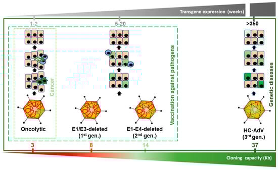 Versions of adenoviral vectors and potential therapeutic applications. The size range allowed for genome packaging is between 28 and 38 Kb. Oncolytic adenoviruses retain most of the viral genome, including the E1 region, which is required for replication. They can accommodate up to 3 Kb of exogenous DNA if the E3 region is partially deleted. Since they replicate their genomes and cause the lysis of infected cells, transgene expression is very intense but transient. Among replication-deficient vectors, E1/E3-deleted (1st generation) versions can harbor up to 8 Kb. This capacity can be extended up to 14 Kb if the E2 and E4 regions are also deleted (second generation). Although these vectors do not cause direct destruction of infected cells, cytotoxic immune responses against them limit the stability of transgene expression. Apart from vaccination strategies, E1/E3-deleted vectors are still a widely used research tool for in vitro and in vivo gene transfer. High-capacity adenoviral vectors (HC-AdVs) (third generation) only retain short non-coding regions from the AdV genome (ITRs and ψ signal), which leaves a cloning capacity of 37 Kb. The lack of viral gene expression in transduced cells reduces cellular immune responses and allows long-term transgene expression, which decreases slowly as the cells are renewed. HC-AdVs are suitable for all in vivo applications, including gene supplementation and gene correction for monogenic diseases. The indicated duration of transgene expression is based on liver-directed transduction in NHP, but it can be different in other hosts and tissues. In vector genomes, viral DNA is represented in red and exogenous DNA in green (including expression cassettes and/or DNA templates, and stuffer DNA).
