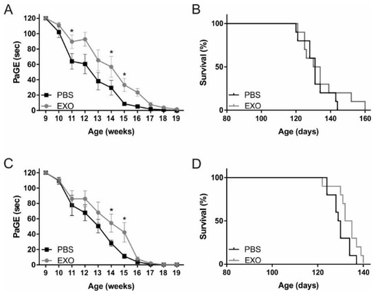 The PaGE test showed that the beneficial effect of ASC-exosomes persists for six weeks and the motor performance progression was similar, irrespective of the route of delivery. In both cases, the beneficial effect observed in ASC-exosomes treated mice disappeared around week 17 of life, whereas no differences were reported between exosomes- and PBS-treated mice (Figure 2A,C).