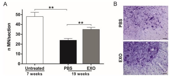 Effect of i.v. ASC-exosomes treatment on motoneurons (MN) survival in SOD1(G93A) mice. (A) The graph shows the significant progressive loss of MN during the disease progression (as compared with untreated mice at week 7 and PBS-treated mice at the end stage of the disease, ** p = 0.0026). The i.v. treatment with ASC-exosomes (EXO) significantly increases the MN survival in the lumbar section (L1–L5) of the spinal cord as compared with the PBS-treated group (** p = 0.0078). Data are shown as mean ± SEM; (B) Representative Nissl staining of the lumbar spinal cord MN of PBS- and ASC-exosomes (EXO) treated mice. Note that a higher MN number in the mice that receive exosomes treatment as compared with the PBS group. Magnification 20×, scale bar 50 µm.