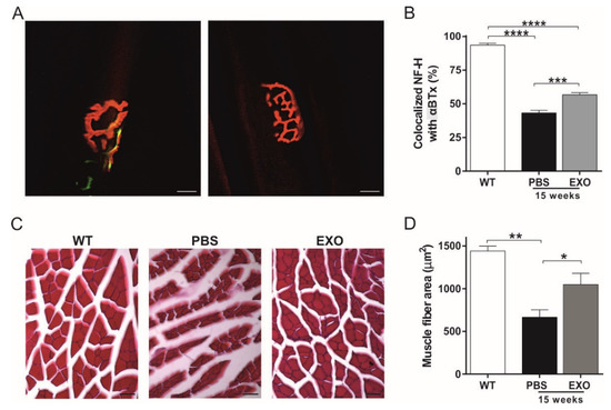 WT (n = 5) and SOD1(G93A) mice PBS- or exosomes-treated (n = 5 per group) were deeply anesthetized and transcardially perfused with PBS 0.1 M followed by paraformaldehyde 4%. The hindlimb gastrocnemius muscle was dissected out, post-fixed for 2 h, soaked in 30% sucrose, included in OCT, and longitudinally cut at 20 µm with cryostat apparatus. The sections were mounted on Surgipath® Apex™ Superior Adhesive Slides (3800080E, Leica Biosystems Italia, Milan, Italy). The sections were washed with PBS Triton for 20 min and stained for postsynaptic acetylcholine receptors using CF543 conjugates α-bungarotoxin (αBTx, 1:500, Biotium, DBA Italia Srl, Milan, Italy) for 25 min at room temperature. The sections were washed and incubated for 1 h in 10% NDS and 0.3% Triton X-100 in PBS. Presynaptic motor terminals were labeled using anti-neurofilament H (NF-H; 1:100, Chemicon, Merck, Milan, Italia) overnight at 4 °C. After washing, the sections were incubated with species-specific Alexa Fluor 488 secondary antibody in 2% NDS in PBS (1:1000; Invitrogen, Thermo Fisher Scientific, Milan, Italy) for 1 h at room temperature. After washing, the sections were incubated with DAPI (1:1000; Santa Cruz Biotechnology, DBA Italia Srl, Milan, Italy) for 3 min at room temperature. Sections were washed and mounted with Dako Fluorescence Mounted Medium (Agilent, CA; USA) and dried prior to analysis.