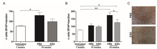 Analysis of glial cells was performed on the lumbar section of the spinal cord of exosomes- and PBS-treated mice. We found a progressive increase in astrocyte activation during the disease course (comparing mice at the preclinical stage of the disease to the PBS-treated mice and at 15 and 19 weeks), which reached a significant difference at 19 weeks for both i.v. and i.n. treatments (p = 0.05 and p = 0.006, respectively, Figure 6A,B).