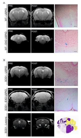 In the SOD1(G93A) mice, high-resolution T2 map MR images were performed to identify the lesioned areas, localized in brainstem regions corresponding to the trigeminal and facial motor nuclei (Figure 7B), according to the literature [15,16]. The T2*-weighted MR images obtained in the SOD1(G93A) mice pre and 3 h post i.n. administration of only USPIO showed that nanoparticles are randomly distributed in the brain, as in the WT mice (Figure 7B); in all the analyzed brains of the SOD1(G93A) mice that received only USPIO, the signal was detected in different brain areas. Interestingly, in the SOD1(G93A) mice that received exosomes-USPIO, the MR images acquired 3 h post-administration and the subsequent histological staining showed that exosomes reached the injured area of the brains of the mice, indicating the ability of ASC-exosomes to home to the lesioned sites in ALS disease (Figure 7B).