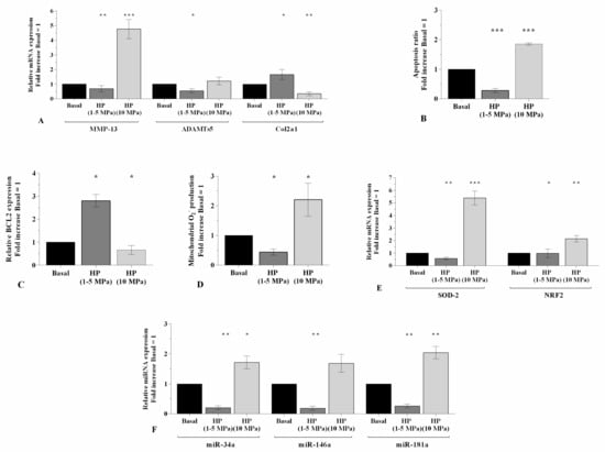 Figure 1 shows the effects of 3~h-application of low sinusoidal or static continuous HP cycles in regulating the gene expression of matrix degrading enzymes, Col2a1, and miRNA, the percentage of apoptotic cells and the oxidative stress balance, in OA chondrocyte cultures. The exposure of the cells to low sinusoidal HP (1–5 MPa) determined a significant reduction of MMP-13 (p < 0.01), ADAMTS-5 (p < 0.05), and an up-regulation of Col2a1 mRNA levels (p < 0.05), in comparison to basal condition (Figure 1A). A decrease of apoptotic cells (p < 0.001, Figure 1B) and an increase of BCL2 gene (p < 0.05, Figure 1C) were also found. Furthermore, low HP reduced mitochondrial superoxide anion production (p < 0.05, Figure 1D), SOD-2 (p < 0.01) and NRF2 (p < 0.05) (Figure 1E) transcriptional levels, and miR-34a, miR-146a, miR-181a (p < 0.01, Figure 1F) gene expression. On the contrary, a cycle of static continuous HP (10 MPa) significantly up-regulated the gene expression of MMP-13 (p < 0.001), SOD-2 (p < 0.001), NRF2 (p < 0.01) of the studied miRNA (p < 0.01), and decreased the mRNA levels of Col2a1 (p < 0.01) and BCL2 (p < 0.05). This pressure significantly induced apoptosis and ROS production (p < 0.001, p < 0.05, respectively, Figure 1A–F).