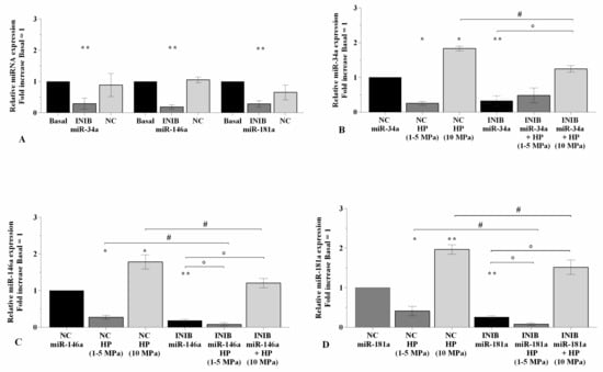 To confirm the effect of HP in modulating miR-34a, miR-146a, and miR-181a expression, OA cells were transiently transfected with miRNA specific inhibitors for 24~h before the application 3~h of the studied cycles of pressurization (Figure 2). Real-time PCR analysis revealed the ability of inhibitors to significantly reduce the gene expression of miR-34a, miR-146a, and miR-181a (p < 0.01) in comparison to basal condition and negative control (NC) (Figure 2A). The exposure to low sinusoidal HP significantly down-regulated the transcriptional levels of the studied miRNA (p < 0.01, Figure 2B–D) in OA chondrocytes transfected with NC. Afterwards the silencing of miRNA, the cells subjected to low HP showed a reduction of miR-146a and miR-181a expression levels (p < 0.05) compared to the chondrocytes transfected with the inhibitors or exposed to low HP alone, while no significant modifications on miR-34a were observed (Figure 2B–D). Conversely, when NC transfected cells were exposed to static continuous HP a significant increase of miRNA expression was showed (p < 0.05 for miR-34a, p < 0.01 for miR-146a, miR-181a, Figure 2B–D). This up-regulation (p < 0.05) was also observed in inhibited chondrocytes put through to high HP with respect to the cell cultures incubated with miRNA inhibitors. However, miRNA gene expression in transfected cells exposed to pressurization was significantly lower (p < 0.05) than what is observed after continuous HP exposure alone (Figure 2B–D).