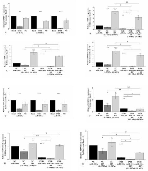 miRNA inhibition reduces the expression of matrix degrading enzymes altered by HP. (A–H) Expression levels of MMP-13 and ADAMTS-5 analyzed by real-time PCR. Human osteoarthritic (OA) chondrocytes were evaluated at basal condition, after 24~h of transfection with miR-34a, miR-146a, and miR-181a inhibitors (50 nM) or NC (5 nM), and after 3~h of low sinusoidal (1–5 MPa) or static continuous (10 MPa) HP exposure. The gene expression was referenced to the ratio of the value of interest and the value of basal condition or NC, reported equal to 1. Data were expressed as mean ± SD of triplicate values. * p < 0.05, ** p < 0.01, *** p < 0.001 versus basal condition or NC. ° p < 0.05 versus inhibitor. # p < 0.05, ## p < 0.01 versus HP. INIB = Inhibitor, NC = negative control siRNA.