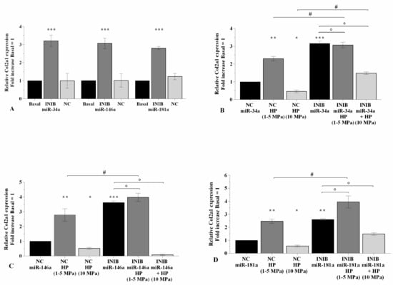 miRNA inhibition induces the expression of Col2a1 altered by HP. (A–D) Expression levels of Col2a1 analyzed by real-time PCR. Human OA chondrocytes were evaluated at basal condition, after 24~h of transfection with miR-34a, miR-146a, and miR-181a inhibitors (50 nM) or NC (5 nM), and after 3~h of low sinusoidal (1–5 MPa) or static continuous (10 MPa) HP exposure. The gene expression was referenced to the ratio of the value of interest and the value of basal condition or NC, reported equal to 1. Data were expressed as mean ± SD of triplicate values. * p < 0.05, ** p < 0.01, *** p < 0.001 versus basal condition or NC. ° p < 0.05 versus inhibitor. # p < 0.05 versus HP. INIB = Inhibitor, NC = negative control siRNA.