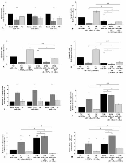 miRNA inhibition mediates HP effect on apoptosis. (A–D) Apoptosis detection performed by flow cytometry analysis and measured with Annexin Alexa fluor 488 assay. Data were expressed as the percentage of positive cells for Annexin-V and propidium iodide (PI) staining. (E–H) Expression levels of BCL2 analyzed by real-time PCR. Human OA chondrocytes were evaluated at basal condition, after 24~h of transfection with miR-34a, miR-146a, and miR-181a inhibitors (50 nM) or NC (5 nM), and after 3~h of low sinusoidal (1–5 MPa) or static continuous (10 MPa) HP exposure. The ratio of apoptosis and the gene expression were referenced to the ratio of the value of interest and the value of basal condition or NC, reported equal to 1. Data were expressed as mean ± SD of triplicate values. * p < 0.05, ** p < 0.01 versus basal condition or NC. ° p < 0.05 versus inhibitor. # p < 0.05, ## p < 0.01 versus HP. INIB = Inhibitor, NC = negative control siRNA.