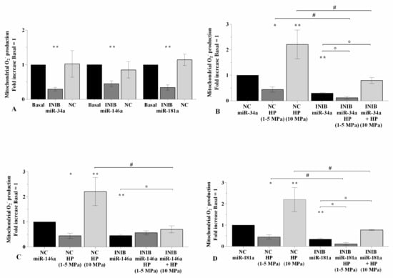 miRNA silencing regulates oxidative stress following HP exposure. (A–D) Mitochondrial superoxide anion production evaluated by MitoSox Red staining at flow cytometry. Human OA chondrocytes were evaluated at basal condition, after 24~h of transfection with miR-34a, miR-146a, and miR-181a inhibitors (50 nM) or NC (5 nM), and after 3~h of low sinusoidal (1–5 MPa) or static continuous (10 MPa) HP exposure. The production of superoxide anion was referenced to the ratio of the value of interest and the value of basal condition or NC, reported equal to 1. Data were expressed as mean ± SD of triplicate values. * p < 0.05, ** p < 0.01 versus basal condition or NC. ° p < 0.05 versus inhibitor. # p < 0.05 versus HP. INIB = Inhibitor, NC = negative control siRNA.
