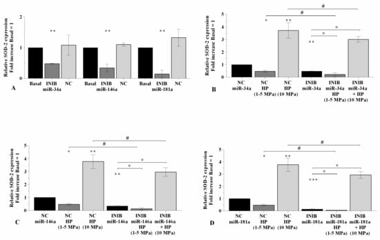 miRNA silencing regulates SOD-2 expression following HP exposure. (A–D) Expression levels of SOD-2 analyzed by real-time PCR. Human OA chondrocytes were evaluated at basal condition, after 24~h of transfection with miR-34a, miR-146a, and miR-181a inhibitors (50 nM) or NC (5 nM), and after 3~h of low sinusoidal (1–5 MPa) or static continuous (10 MPa) HP exposure. The gene expression was referenced to the ratio of the value of interest and the value of basal condition or NC, reported equal to 1. Data were expressed as mean ± SD of triplicate values. * p < 0.05, ** p < 0.01, *** p < 0.001 versus basal condition or NC. ° p < 0.05 versus inhibitor. # p < 0.05 versus HP. INIB = Inhibitor, NC = negative control siRNA.