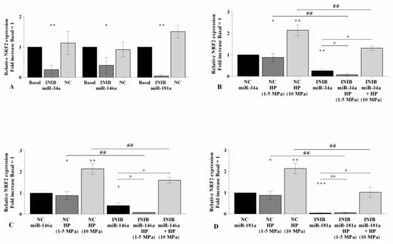 miRNA silencing regulates NRF2 expression following HP exposure. (A–D) Expression levels of NRF2 analyzed by real-time PCR. Human OA chondrocytes were evaluated at basal condition, after 24~h of transfection with miR-34a, miR-146a, and miR-181a inhibitors (50 nM) or NC (5 nM), and after 3~h of low sinusoidal (1–5 MPa) or static continuous (10 MPa) HP exposure. The gene expression was referenced to the ratio of the value of interest and the value of basal condition or NC, reported equal to 1. Data were expressed as mean ± SD of triplicate values. * p < 0.05, ** p < 0.01, *** p < 0.001 versus basal condition or NC. ° p < 0.05, °° p < 0.01 versus inhibitor. ## p < 0.01 versus HP. INIB = Inhibitor, NC = negative control siRNA.