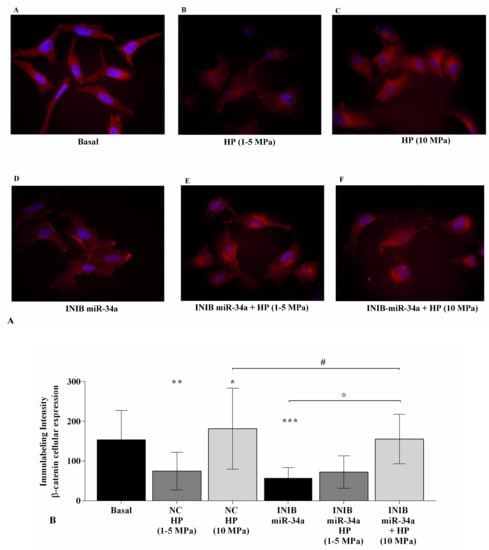 miR-34a inhibition mediates HP effect on β-catenin protein expression. Immunofluorescence labeling of β-catenin localization. Human OA chondrocytes were evaluated at basal condition, after 24~h of transfection with miR-34a inhibitor, and after 3~h of low sinusoidal (1–5 MPa) or static continuous (10 MPa) HP exposure. (A) Representative immunocytochemical images of the cells showing localization of β-catenin (red); nuclei were stained with DAPI (blue). Original magnification 400×. Scale bar: 20 µm. (B) The histogram of immunolabeling intensity was plotted for the nuclear and cytoplasm expression for β-catenin. Data were expressed as mean ± SD of triplicate values. * p < 0.05, ** p < 0.01, *** p < 0.001 versus basal condition. ° p < 0.05 versus inhibitor. # p < 0.05 versus HP. INIB = Inhibitor.