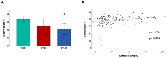 (A) Cytosine-phosphate-guanine island (CpGI) shore methylation at CpG9 in menopausal groups. Methylation levels are significantly lower in postmenopausal women compared to premenopausal women. (B) The mean methylation of CpGI shore is significantly positively associated with E2 levels (r = 0.224, p = 0.014). Robust regression was used to put less weight on extreme values. * p < 0.05. Abbreviations: PRE = premenopausal; PERI = perimenopausal; POST = postmenopausal.