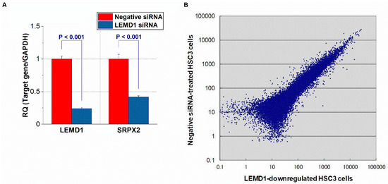 Microarray analysis of HSC3 cells with suppressed LEM domain containig 1 (LEMD1) expression. (A) Expression of LEMD1 in control HSC3 cells and HSC3 cells with down regulation of LEMD1. (B) Scatter plot of gene variation in HSC3 cells and LEMD1-downregulated HSC3 cells in the microarray analysis. p value < 0.05 was regarded ad statistically significant.
