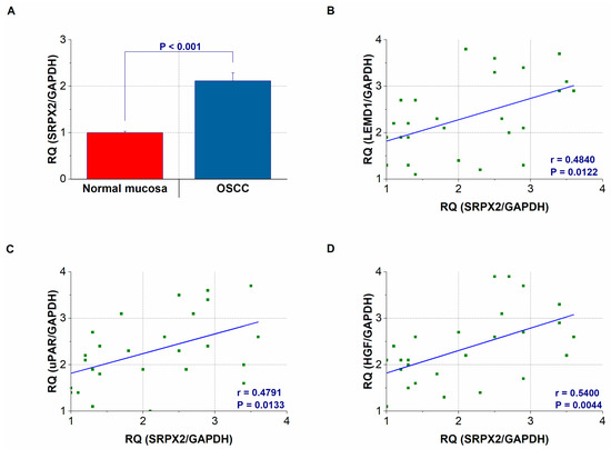 Gene expression and secretion of sushi repeat containing X-linked 2 (SRPX2). (A) SRPX2 expression levels in oral squmous cell carcinoma (OSCC) and non-cancerous oral mucosa. (B–D) The expression levels of SRPX2 are correlated with those of LEMD1 (B), urokinase plasminogen activator receptor (uPAR) (C), and hepatocyte growth factor (HGF) (D) in OSCC tissues. Error bar, standard deviation (SD). RQ: relative quantification.