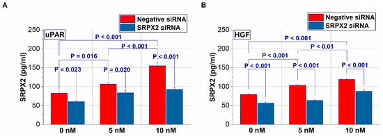 The changes in sushi repeat containing protein X-linked 2 (SRPX2) secretion levels by urokinase plasminogen activator receptor (uPAR) (A) and hepatocyte growth factor (HGF) (B) recombinant proteins in HSC3 cells. Error bar, standard deviation (SD).