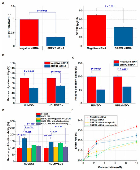 In vitro functional analysis of sushi repeat containing X-linked 2 (SRPX2) on endothelial cells and chemosensitivity. (A) The expression and secretion change of SRPX2 by SRPX2-knockdown treatment in HSC3 cells supernatant. (B) The regulation of migration of human umbilical vain endothelial cells (HUVECs) and human dermal lymphatic microvascular endothelial cells (HDLMVECs) by SRPX2. (C) The modulation of adhesion between endothelial cells and HSC3 cells by SRPX2. (D) The conditioned medium (CM) of SRPX2-producing HSC3 cells promotes the proliferation of endothelial cells, whereas their effects are offset by uPAR and HGF antibodies. (E) The influence of SRPX2 on the resistance of HSC3 cells to platinum agents.