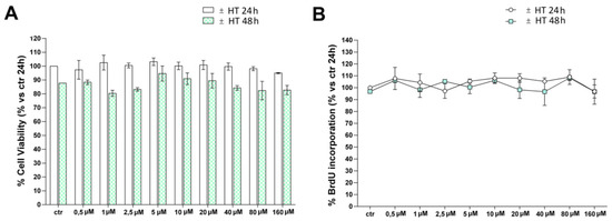 Figure 1. Evaluation of HT effect in HUVECs. HUVECs were cultured for 24 h or 48 h with different concentrations of HT (0–160 µM), before MTT assay (A) or BrdU incorporation (B). Results are expressed as mean (±SD), and are representative of four independent experiments carried out in triplicate. Data are reported as percentage vs. control (untreated cells at 24 h) (2-way ANOVA).