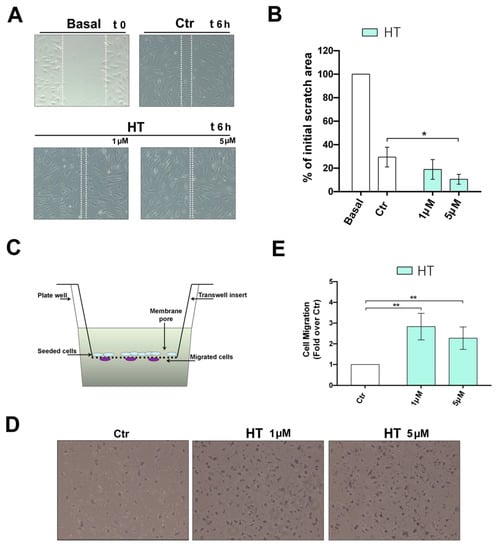 Figure 2. Improvement of the migratory capacity of HUVEC cells exposed to HT. (A) Wound healing assay were carried out in HUVECs treated for 6 h with HT at the indicated concentrations (1–5 µM) in complete medium. Light microscope images are representative of three independent experiments. Dotted white lines indicate the wounded area from the initial scratch. Magnification × 100; (B) Histograms correspond to the mean scratch area obtained in HUVEC cultures, and are expressed as a percentage with respect to the initial area. The measurement was carried out in three different experiments. Results are shown as mean (±SD) (2-way ANOVA, * p < 0.05). (C) Cell migration was determined in the Boyden chamber system after seeding HUVECs in the upper insert and treatment with HT. (D) Cells that migrated beneath the membrane were fixed and stained and representative light microscope images of three independent experiments are shown (10 × magnification). (E) The effects of HT on cell migration, at the indicated concentrations, were observed after overnight incubation. Results, reported as folds over the control, are shown as mean (±SD) (2-way ANOVA, ** p < 0.01).
