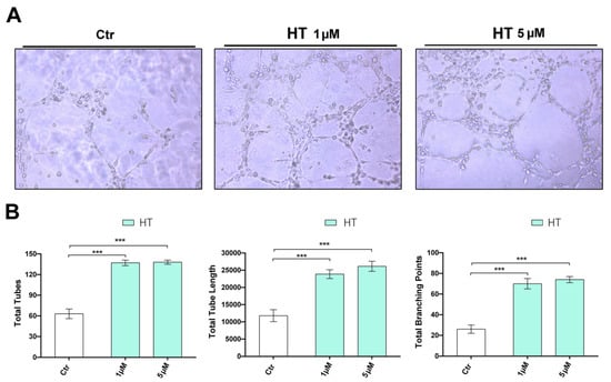 We next tested HT for its effect on the morphologic differentiation of endothelial cells into tube-like structures, a fundamental step for the angiogenesis process. To replicate in vitro the conditions that best mimic the in vivo microenvironment, which allows the differentiation of the capillaries, we plated endothelial cells into a Matrigel coat and carried out a 2-dimensional tube-formation assay. The angiogenic response was assessed by quantification of the capillary network that was formed after 6 h. HT, at the concentrations tested, promoted HUVECs tube formation, increasing both the number of total tubes, the overall tube length and the branching points (Figure 4A,B).