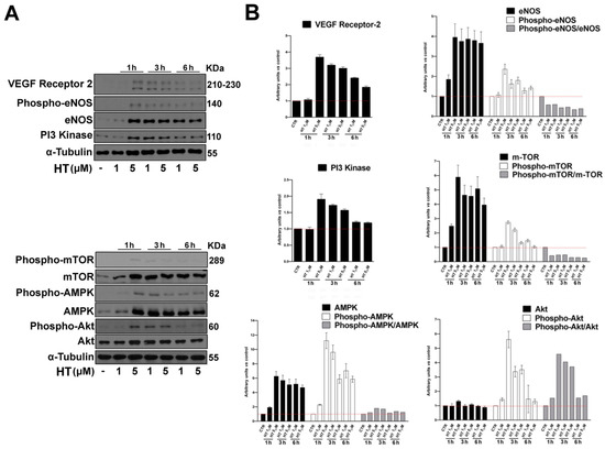 To establish the mechanism at the basis of HT stimulation of the angiogenic process, we analyzed by western blot the expression of several proteins involved in the process, from angiogenic growth factors’ signaling, to proliferation and organization into new stable vessels. To this end, we treated cells with HT 1 and 5 µM for increasing time points (1 h, 3 h and 6 h), as shown in Figure 5A,B. We observed an upregulation in the expression and activation of the vascular endothelial growth factor (VEGF) receptor-2, eNOS, PI3-Kinase, m-TOR, AMPK and Akt, which are all involved in the formation and maturity of new capillary tubes [29]. It is well-recognized that eNOS plays a central role in endothelial cells, and that its activation is elicited by PI3K/AKT/mTOR pathway stimulation, which is involved in numerous cellular functions underlying angiogenesis, including proliferation, adhesion, migration and invasion, together with interconnected key angiogenic signal stimulators downstream VEGFR.