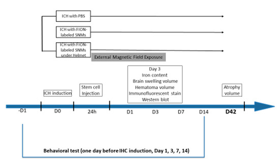 Schematic diagram representing the overall study design. Ferromagnetic iron oxide nanocubes (FIONs)–spherical neural masses (SNMs) were prepared from in vitro procedures before in vivo experiments. One day before the induction of intracerebral hemorrhage (ICH), rats were subjected to a behavioral test. On day 0, ICH was induced. On day 1, FION-labeled SNMs were injected. A magnet-embedded helmet was applied to the rats in the external magnetic field exposure group for three days after injection. On day 3, the rats were sacrificed for an analysis of the iron content, brain swelling volume, hematoma volume, immunofluorescent staining, and Western blotting. Rats were decapitated on day 42 after ICH to calculate the atrophy volume. Behavioral tests were performed on days -1, 1, 3, 7, and 14 after injection.