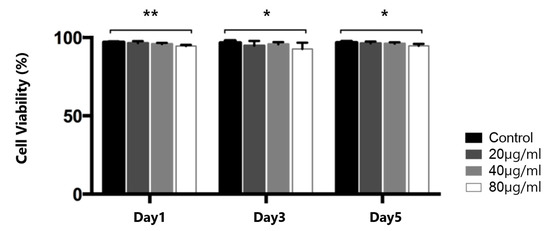 We determined the toxic effect of the FIONs on the SNMs using the cell counting kit-8 (CCK-8) assay. To determine the optimal concentration to balance the effectiveness of the tagging and cellular toxicity, a cell viability analysis was performed at three different concentrations of FIONs (20, 40, and 80 µg/mL), as shown in Figure 2. There was no significant difference between the numbers of cells in the control vs. the presence of the 20 µg/mL and 40 µg/mL FIONs on days 1, 3, and 5 (day 1, 98.0 ± 2.3% and 96.9 ± 1.8%; day 3, 93.2 ± 5.5% and 95.2 ± 2.3%; day 5, 96.9 ± 5.2% and 95.7 ± 7.5%, respectively). There was a significant decrease in the viability of SNMs exposed to 80 µg/mL of FIONs (day 1, 93.1 ± 1.9%, p = 0.003; day 3, 90.2 ± 7.4%, p = 0.041; day 5, 93.2 ± 2.3%, p = 0.038, respectively). The concentration of 40 µg/mL FIONs was chosen based on the viability analysis.