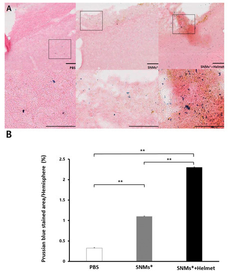 At day 3 post-ICH induction, optical imaging of the Prussian blue staining of the slides to identify FION-labeled SNMs was observed in the animals injected with phosphate-buffered saline (PBS group), FION-labeled SNMs (SNMs* group), and the group of FION-labeled SNMs under a magnet-embedded helmet application for three days (SNMs*+Helmet group, Figure 4A). The relative Prussian blue-stained area was significantly greater in the SNMs*+Helmet group than in the PBS or SNMs* groups (2.3 ± 0.02 mm2 vs. 0.3 ± 0.01 mm2, p < 0.001 and 1.1 ± 0.01 mm2, p < 0.001; respectively). There was a significant difference between the PBS and SNMs* groups (p < 0.001) (Figure 4B).
