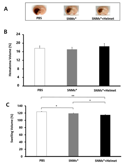 Measurements of the hematoma volume and swelling volume. (A) Photographic images of brain sections covering the perihematomal area in the ICH of the PBS, SNMs*, and SNMs*+Helmet groups. The absolute areas of hematoma and swelling in the ICH model were analyzed using an image analyzer (n = 6 for each group). (B) There was no difference among the hematoma volumes in the PBS, SNMs*, and SNMs*+Helmet groups. (C) The swelling volume decreased significantly in SNMs*+Hlemet group compared with that in the PBS and SNMs* groups. (* p < 0.05, ** p < 0.005).