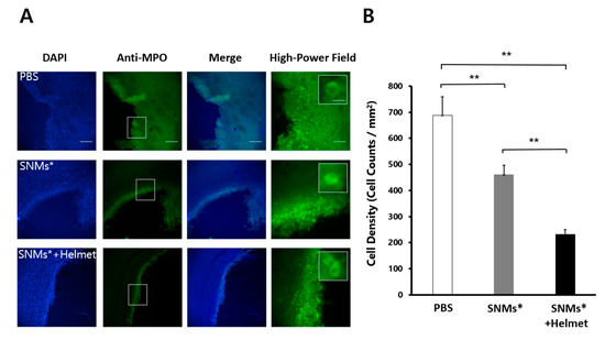 DAPI and anti-myeloperoxidase (MPO) in the perihematomal area after 3 days of ICH induction in the PBS, SNMs*, and SNMs*+Helmet groups. (A) Representative microphotographs are shown. High-magnification images of the area outlined. Scale bar of columns 1–3: 100 µm, column 4: 25 µm. (B) The density of the MPO-positive cells in the SNMs*+Helmet group was significantly lower than that in the PBS and SNMs* groups. (** p < 0.005; n = 3 for each group).