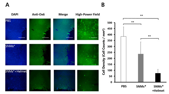 DAPI and monoclonal anti-Ox-6 antibodies in the perihematomal area after 3 days of ICH induction in the PBS, SNMs*, and SNMs*+Helmet groups. (A) Representative microphotographs are shown. High-magnification images of the area outlined. Scale bar of columns 1–3: 100 µm, column 4: 25 µm. (B) The density of the Ox-6-positive cells in the SNMs*+Helmet group was significantly lower than that in the PBS and SNMs* groups. (** p < 0.005; n = 3 for each group).