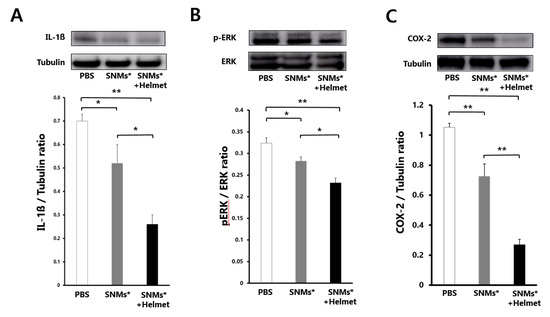 Western blot analysis after 3 days of ICH induction in the PBS, SNMs*, and SNMs*+Helmet groups. Photographic images and quantification analysis of (A) normalized IL-1ß, (B) proportion of extracellular signal-regulated kinase (ERK) and phosphorylated extracellular signal-regulated kinase (pERK), (C) normalized cyclooxygenase-2 (COX-2). (* p < 0.05, ** p < 0.005; n = 3 for each group in each test).