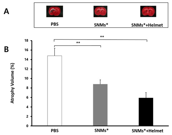 Atrophy volume after ICH induction. Atrophy size of rat brains was measured by triphenyl tetrazolium chloride-stained sections 42 days after induction of ICH. (A) Representative microphotographs are shown. (B) The atrophy volume in the ICH model, analyzed using an image analyzer, showed a significant decrease in the SNMs* and SNMs*+Helmet groups compared with that in the PBS group. (** p < 0.005; n = 6 for each group in each test).