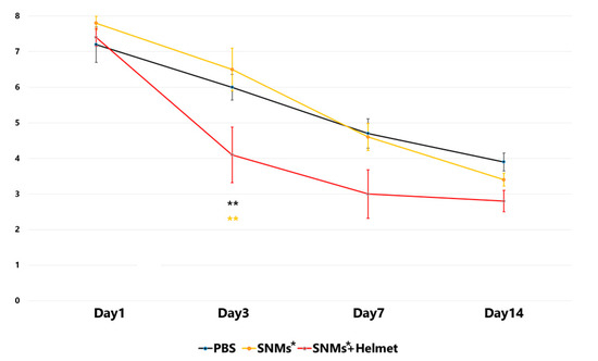We evaluated neurological function from the day before to the 14th day after ICH induction using a limb placement test. The limb placement tests conducted the day before ICH scored 0 for all subjects in three groups. In the PBS group, the limb placement test score peaked (7.2 ± 0.5) one day after ICH and decreased to 6.0 ± 0.4 on day 3, 4.7 ± 0.4 on day 7, and 3.9 ± 0.2 on day 14. In the SNMs* group, the score was 7.8 ± 0.2 on day 1, 6.5 ± 0.6 on day 3, 4.6 ± 0.4 on day 7, and 3.4 ± 0.2 on day 14. In the SNMs*+Helmet group, there was a significant decrease on day 3 (7.4 ± 0.3 on day 1, 4.1 ± 0.8 on day 3, 3.0 ± 0.7 on day 7, and 2.8 ± 0.3 on day 14) compared with the PBS and SNMs* groups, with p < 0.001 and p = 0.002, respectively. (Figure 10) However, no significant difference was observed between the groups on days 1, 7, and 14 after induction of ICH. These results suggest that the targeted delivery of SNMs* improved neurological function recovery during the early phase of the disease.