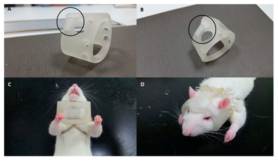 Photographs of the magnet-embedded helmet and its application. Two magnets were embedded under a helmet made by a 3D printing method, as shown in the (A) lateral and (B) oblique views. The black circles indicate the positions of the two magnets. The helmet was attached to the rat just to the extent that it would move freely with flexible polyvinyl chloride laboratory tubes, as shown in the (C) bottom and (D) top views.