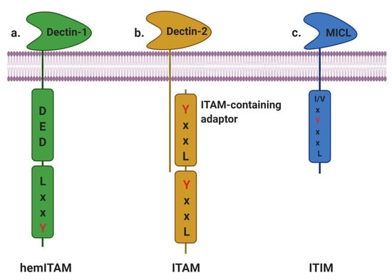 Myeloid CTLRs, based on cytoplasmic signaling networks, can be divided into three leading groups: ITAM-bearing CTLRs, ITIM-bearing CTLRs, and non-immunoreceptor tyrosine-based motif-bearing CTLRs [18]. The signaling families of myeloid CTLRs are described in Figure 1.