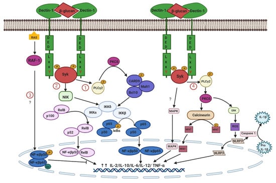 45. Gringhuis, S.I.; den Dunnen, J.; Litjens, M.; van der Vlist, M.; Wevers, B.; Bruijns, S.C.M.; Geijtenbeek, T.B.H. Dectin-1 directs T helper cell differentiation by controlling noncanonical NF-κB activation through Raf-1 and Syk. Nat. Immunol. 2009, 10, 203–213. [Google Scholar] [CrossRef] [PubMed]