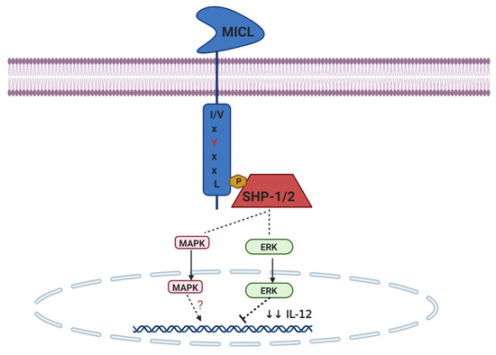 Figure 3. The signaling networks of MICL. The ITIM motif within MICL interacts with SHP-1 and SHP-2. MICL inhibits cytokine transcription instigated by other receptors. ERK may suppress IL-12 expression and the polarization of Th1 cells, whereas another signaling induces their activation through MAPK. Dashed arrows represent a pathway that has yet to be fully defined.