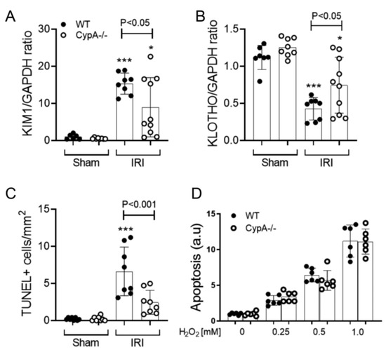 Tubular damage and cell death at 24 h in renal IRI and sham controls for WT (closed circles) and CypA−/− (open circles) mice. RT-PCR for mRNA levels of (A) KIM1, and (B) Kotho. (C) Quantification of the number of TUNEL+ tubular cells. (D) A dose-response of H2O2 induced cell death in primary cultures of tubular epithelial cells from WT and CypA−/− mice. Data are mean ± SD. * p < 0.05, *** p < 0.0001 versus WT sham control.