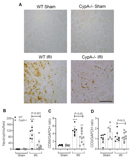 Neutrophil and macrophage infiltration at 24 h in renal IRI and sham controls for WT (closed circles) and CypA−/− (open circles) mice. (A) Immunoperoxidase staining for infiltrating neutrophils. Bar = 100 μm. (B) Quantification of neutrophil infiltration. RT-PCR analysis of (C) CD68, and (D) CD3 mRNA levels. Data are mean ± SD. ** p < 0.05, *** p < 0.0001 versus WT sham control. NS, not significant.