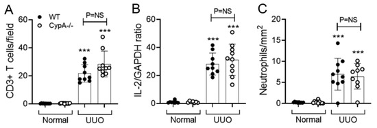 T cell and neutrophil infiltration in day 7 UUO kidney compared to normal controls for WT (closed circles) and CypA−/− (open circles) mice. (A) Quantification of the number of stained CD3+ T cells. (B) RT-PCR for IL-2 mRNA levels. (C) Quantification of the number of stained neutrophils. Data are mean ± SD. *** p < 0.0001 versus WT sham control; NS, not significant.